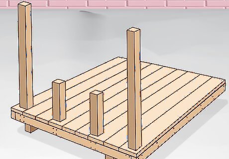 Lay your floor boards down and nail them into the joists. You may need to use a jigsaw or circular saw to cut out the fittings for your porch posts. Lay each floorboard down so that they’re parallel and snug against one another. Nail each individual board into the joists in the frame of the floor twice. Do this on both sides of your floor, so that each piece of wood has a total of 4 nails securing it to the floor, with 2 nails placed symmetrically on each end of every board. To cut fittings out of a joist, measure the size of each side that you need to cut and draw it on the joist with a framing square and carpentry pencil. Set the joist on two sawhorses and carefully remove the selected section with your power tool. Treated 2 in × 4 in (5.1 cm × 10.2 cm) boards are excellent for floorboards. Place a nail in between each floor board as you’re securing to keep your spacing uniform between planks.