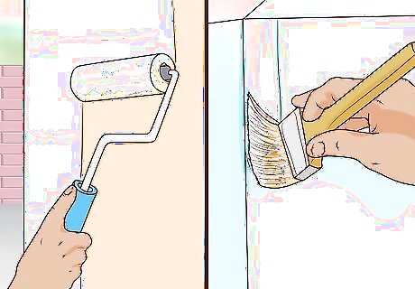 Paint the exterior and interior walls with a roller and brush. Use a paint roller and any sized brush to cover each surface of the playhouse with paint. Any all-purpose latex paint will work with your playhouse. Paint the railings, roof, and interior and exterior walls different colors to really give the playhouse a modern feel. It may take 2-3 applications to fully cover the porous wood with paint. Consider painting the playhouse with your child if they’re old enough to handle a paintbrush. Not only will they have fun, but they’ll feel like the house belongs to them!