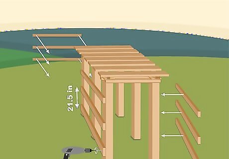 Connect nine 10.5 foot (3.2 m) long lattice strips to the rafters. The 1 by 2 inch (2.5 by 5.1 cm) lattice strips are the final structural part of the arbor. Lay all 9 strips vertically across the horizontal rafters, making sure they are 21.5 inches (55 cm) apart. Now, drive 2.5 inch (6.4 cm) decking screws down through the lattice strips and into the rafters. Take care to drive the screws down at a 90-degree angle to the rafters. Make sure each lattice strip hangs over the first rafter by about 2 inches (5.1 cm). Take care to ensure that each lattice strip is parallel to one another and perpendicular to the rafters.