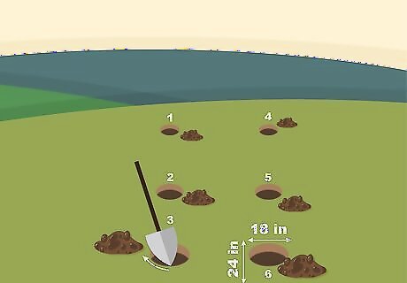 Dig 6 holes 18 inches (46 cm) wide and 24 inches (61 cm) deep. Start by thrusting a shovel into the soil and moving it side to side and forward and backward. After the soil is loosened, grip the middle of the handle with your non-dominant hand and the top with your dominant hand and start digging. Repeat this process to create 6 holes, each spaced 11.68 feet (3.56 m) apart vertically (along the length of the beams) and 4.77 feet (1.45 m) apart horizontally (along the length of the rafters). Saw through any large roots with a reciprocating saw or thrust the shovel down into them until they break. Knock any rocks loose with a steel bar. Use a clamshell digger to remove large portions of loose soil.