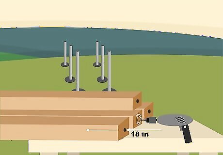 Drill 18 inch (46 cm) deep center holes into the bottom of each post. Attach a 1.5 inch (3.8 cm) spade bit or auger bit to an electric drill. Now, drill a center hole into the bottom of each post to fit over the galvanized metal pipes. After drilling your holes all 18 inches (46 cm) of the galvanized piping should fit into each one. The remaining 24 inches (61 cm) should be covered by cement.
