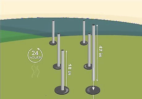 Insert galvanized metal pipes into the center of each cement hole. Take your 42 inch (110 cm) long galvanized pipes and position them in the center of the holes with 18 inches (46 cm) sticking out from the top. Let the concrete sit for at least 24 hours before moving to the next step. Be sure that the pipe has a diameter of ⁄2 inch (1.3 cm).