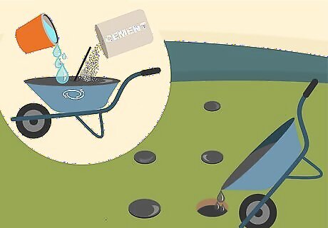 Fill each of the holes with cement. Combine the cement mix and water in a wheelbarrow according to the manufacturer's directions. Now, tilt the wheelbarrow forward gently to pour the cement into each hole. Afterward, slide a hand float over the surface of the cement until it's level with the ground.