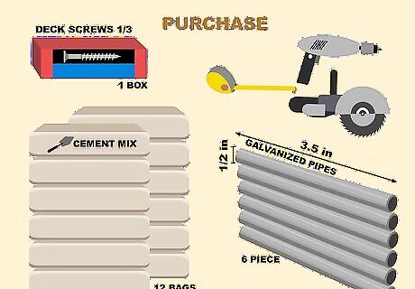 Buy the remaining cement, pipes, screws, and tools. After you get your wood, purchase 12 bags of cement mix—roughly 2 for each hole. Afterward, you need six 42 in (110 cm) long galvanized pipes ⁄2 inch (1.3 cm) in diameter, a box of 3.5 inch (8.9 cm) galvanized decking screws, an electric drill, a circular saw, and measuring tape. Skip the circular saw if you had a professional cut your wood for you. Purchase cement mix designed for fences and posts.