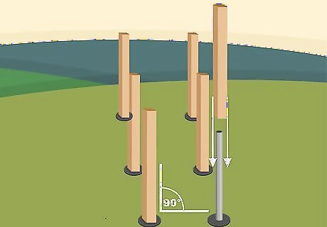 Lower the posts over the galvanizing pipes. Align each post vertically beside the pipes so that the flat ends face the sky and the hole faces the ground. Now, lift each one up and align their holes over the piping. Once the holes are aligned, slowly lower them onto the piping. Make sure that each post is perfectly vertical and makes a 90-degree angle to the ground. Place a cedar shingle shim underneath any posts that are not completely vertical.