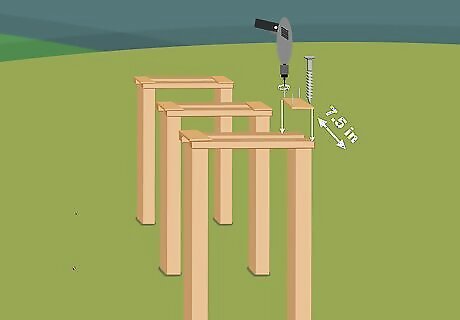 Connect 3 pairs of double 2 by 2 by 8 inch (5.1 by 5.1 by 20.3 cm) beams. Lay each pair of beams parallel and 7.5 inches (19 cm) apart from each other. Now, attach two 7.5 by 7.5 inch (19 cm × 19 cm) pieces of pressure-treated plywood to your beams—one on each end 2.91 feet (0.89 m) from the edges of the beams. Fasten them to the bottom edge of the beams using 6 3.5 inch (8.9 cm) galvanized decking screws, taking care to space them out evenly. The plywood both connects the beams and acts as the barrier between your beams and the posts. Drive the screws straight down into the beams at a 90-degree angle to the plywood. Make sure to connect each piece of plywood to each beam with 3 screws.