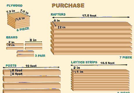 Purchase the necessary wood materials. Head to your local home hardware store. You can either purchase your wood in pieces and cut them to size yourself or ask the hardware store staff to do so for you. For a project like this, the latter is the much easier option. You need the following: Six 7.5 by 7.5 inch (19 cm × 19 cm) pieces of 1.5 inch (3.8 cm) thick plywood Three pairs of 2 by 2 by 8 inch (5.1 by 5.1 by 20.3 cm) beams Four 8 by 8 foot (2.4 m × 2.4 m) posts 10 feet (3.0 m) long Seven 2 by 6 inch (5.1 by 15.2 cm) rafters 17.5 foot (5.3 m) long Nine 1 by 2 inch (2.5 by 5.1 cm) lattice strips 10.5 feet (3.2 m) long