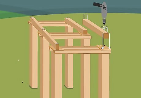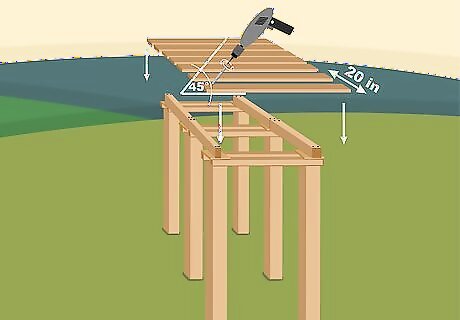 Connect 17.5 foot (5.3 m) long rafters across your beams. The 2 by 6 inch (5.1 by 15.2 cm) rafters lay on top of the beams horizontally. Start by laying down the rafters on top of the beams. Space them about 20 inches (51 cm) apart, making sure that they all run perpendicular to the beams and parallel to each other. Now, drive 3.5 inch (8.9 cm) galvanized decking screws at a 45-degree angle through the rafters and into the beams. Alternate between driving screws through each side of the rafter.