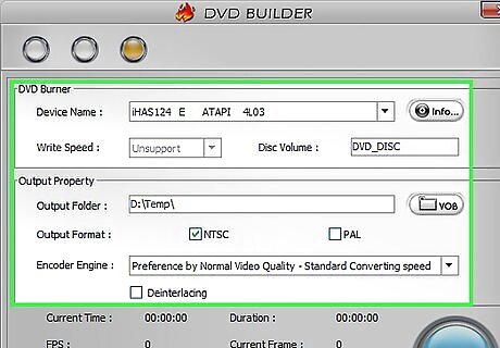 Open the Burn menu in the authoring program. Again, the process will vary depending on the program you are using. There are a few settings that you'll want to check before you actually burn the project to the disc: Set the "Write Speed" low. While it may be tempting to set the speed to MAX or another high value, this can lead to errors on the disc which will prevent it from playing. The best way to ensure that your disc will work is to burn at 2X or 4X only. If you haven't been prompted to select your region yet, check the Burn menu for the NTSC for PAL option and select the appropriate one.