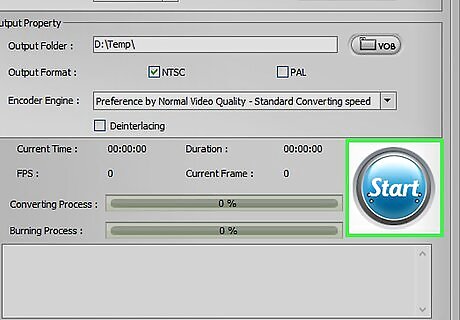 Burn the disc. After reviewing your settings, start the burn process by clicking Start or Burn. If your videos weren't converted yet, they'll be converted before being burned. The entire process may take a while, especially if you've lowered the burn speed. Try to avoid using your computer while it is converting and burning, as this could slow the process down or cause errors. If you're using DeVeDe, the program will only create an ISO (disc image) file. You'll need to then burn the ISO file yourself. See this section for more information.