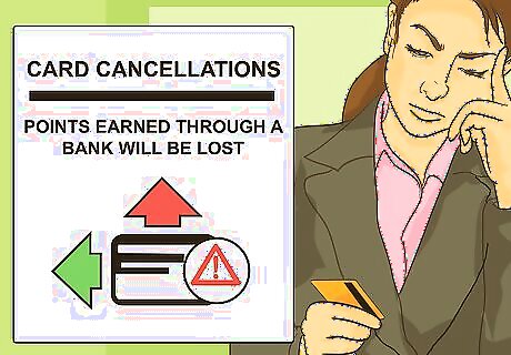 Be aware of how card cancellations affect your points. If your credit card is paired with an airline or a hotel, then your points are most likely earned with that company rather than the bank. Cards that are not paired with another company will only earn points with the issuing bank or credit company. Points earned through a second company (like an airline or hotel) are safe when you cancel, but points earned through a bank will be lost.