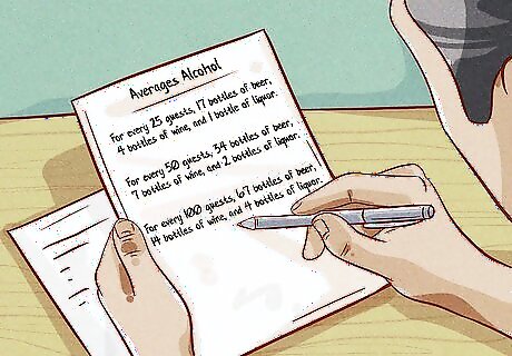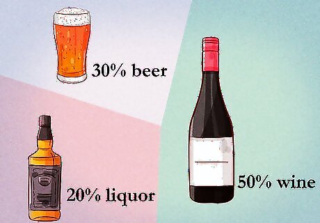 Consider the drinking tendencies of your guests. You should calculate the alcohol you plan to buy based on what your guests are more likely to drink. If your guests are more of a beer and wine crowd, then you can purchase a larger portion of beer and wine and save costs by purchasing less liquor. Asking your guests what they plan to drink when they RSVP can be considered tacky, but you could ask them what they plan to drink with their meal to get an idea of what they’ll be drinking.