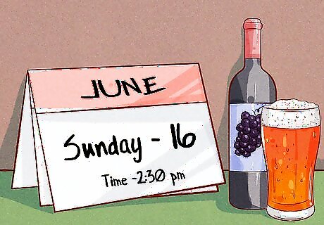 Choose a date and time to influence what people will drink. The day of the week and the time of the reception will inform what type of alcohol people will likely drink, and how much they’ll drink. People will drink differently for a daytime wedding on a Sunday than they will for a wedding reception on a Friday night. For daytime weddings, people tend to drink more wine and beer than liquor. People drink more liquor and beer for nighttime receptions, especially on a Friday or Saturday.