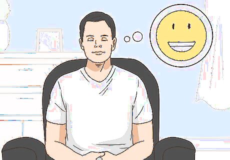 Smile. Even faking happiness can trick you into feeling happy. Put a smile on your face, even a goofy grin, and it will be hard to stay as stressed. Relaxing your forehead, especially the area between your eyebrows, is another good facial muscle to force into a less stressful position. A furrowed, or tightened brow, is a common sign of anger or stress, so forcing it into a relaxed state can help to diminish those feelings.