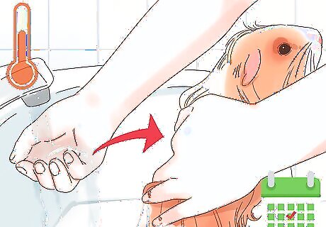 Bathe your guinea pig once a month. Most guinea pigs do not need to be bathed. Longer haired breeds may need occasional baths if they get very dirty, however. If your guinea pig gets dirt and grime stuck on its fur, wash your guinea pig in a small bowl. Use lukewarm water just high enough to reach the guinea pig's stomach and lather a shampoo specially formulated for guinea pigs into your coronet's fur. Rinse out the soap thoroughly after washing your guinea pig. You should towel dry your pet after the bath. Keep your pet out of its cage in a guinea pig-safe room until it's completely dry.