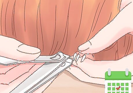 Clip your guinea pig's nails once a month. Like any other breed, the coronet needs to have its claws clipped once a month to prevent nails from becoming overgrown and getting caught on objects in the cage. Have someone else hold your guinea pig still while it's wrapped in a towel. Hold your guinea pig's paw and gently clip just the tips off each nail using a pair of nail clippers. Make sure you only cut the tips of the nails to avoid cutting into the quick and causing bleeding. If you cut into the quick, run corn flower or aluminum sulfate powder on the end of the nail to stop the bleeding. The quick may be marked by a pink line in clearer nails. It can be hard to see the quick in darker nails, so be sure not to cut too far down.