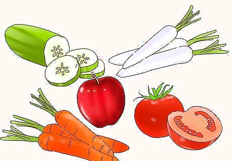 Supplement the hay with healthy fruits and veggies. Give your guinea pigs a cup (240 mL) of vegetables each day and one to two tablespoons (15 to 30 mL) of fruit. Cut and wash fruits and vegetables prior to serving. Carrots, dandelions leaves, watercress, radish, clovers, and cucumbers are all appropriate for guinea pigs. Good fruits include apples, strawberries, plums, and tomatoes. Do not feed guinea pigs bananas, beans, grapes, spinach, mustard greens, and kale as these are toxic. Stay away from anything stringy, like celery, as this is a choking hazard. Do not give your guinea pig cruciferous vegetables, like broccoli, as they cause bloating.