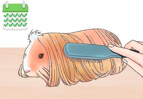 Brush your coronet each day. Due to their long fur, coronet guinea pigs require daily brushing. Use a plastic comb or short brush to brush your coronet's fur, working in the direction of the hair. Work out any tangles each day to prevent the fur from becoming matted. If your guinea pig is new, it may be timid during grooming at first. Go slowly and coax the guinea pig out of the cage with food and treats. Talk to it in a soft voice during grooming to keep it calm and reward it with a treat when you're done.