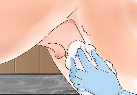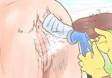 Wash your mare’s genitals to protect the foal. Wet the genital area with warm water, then use a clean sponge dipped in warm, soapy water to clean the outside of her genitals. Then, use your fingers to gently turn the lower part of her labia inside out so you can remove the waxy buildup inside it. Finally, rinse the entire area with warm water. Never, ever put soapy water in your mare’s vagina, as this can cause an infection. Only clean the outside of her labia. Be careful when cleaning your mare’s genitals, as she may attempt to kick you.