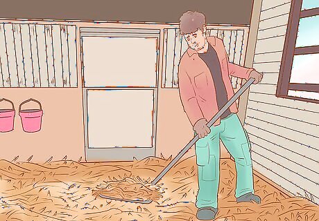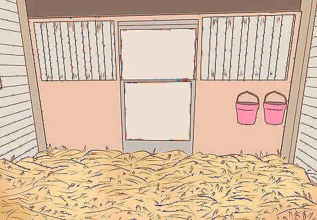 Fill the stable with long straw or hay for bedding. Spread the bedding over the floor of the stall, forming a thick layer of bedding. This helps your mare stay comfortable in her stall, plus it helps you better manage her urine and feces. Never use small pieces of bedding, such as wood chips. These pieces can get caught in your newborn foal’s nose. Use straw or hay from the beginning of the pregnancy so your mare will be comfortable with it by the time the foaling occurs.