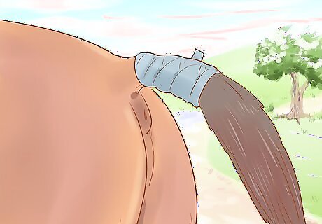 Tie up the mare’s tail when she goes into labor so it’s out of the way. Fold the tail up so it’s shortened. Then, wrap clean plastic wrap around the tail to keep the area sanitary and hold in the hair. Secure the plastic wrap around the tail with rubber bands or additional plastic wrap. Tie it in 2 or 3 spots to make sure it won’t come loose. Make sure your ties aren’t too tight and take down the tail shortly after the foaling. Otherwise, you might accidentally cut off circulation to the tail, which can permanently damage it.