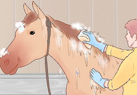 Wash your mare with a horse shampoo a week before foaling to remove germs. Your horse needs to be clean for the foaling so that the foal doesn’t come into contact with germs or bacteria. You don’t want to risk infecting the foal. Rinse your horse with warm water, then use a clean sponge to create a lather with the soap. Rinse the soap away, then apply a conditioner if you have one. After your rinse away the conditioner, you can dry off the horse with a large towel. It helps to wash the horse in sections. For example, you might wash the left side, followed by the right side. Then, you could wash the face and neck.