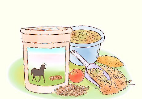 Provide a protein supplement starting in the 8th month of pregnancy. Your mare will need a lot of protein to ensure the health of her foal. It’s unlikely she’ll eat enough food to meet her protein requirements, but a supplement will help. The supplement often comes in pellet form, which you can add to the feed. Look for a protein supplement at your local feed store or online. You can even find supplements that also contain salt, calcium, and phosphorus, as well as protein. This makes supplementing her diet even easier!
