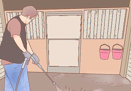 Disinfect the stall a few days before the expected foaling. Remove the mare from the stall, such as by turning her out in the pasture. Then, remove all of the bedding, as well as the water bucket and feed bag or bucket. Use a mild disinfectant to clean the floor and walls of the stall. Then, rinse the entire stall and let it dry. Fill the stall with fresh bedding and return the water bucket and feed bag or bucket. While the stall dries, scrub down the water bucket. If you use a feed bucket, you’ll also want to scrub it down. This ensures your foal is born into a clean, healthy environment.