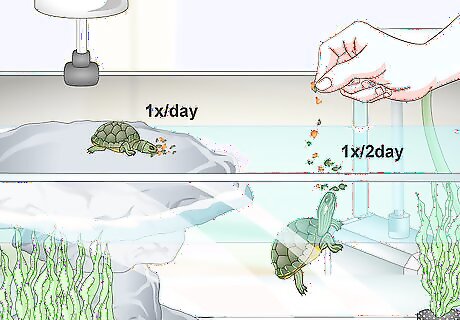 Feed young turtles daily and adult turtles every other day. Because juvenile turtles require more nutrition and calories, give younger turtles under the age of 7 the proper mix of food every day. Feed adult turtles, which are older than 7, 4 to 5 times a week. Measure out their food by giving them an amount equal to the size of their head. If you go to feed your turtle and there’s leftover food from the day before, remove it and give your turtle fresh food. Old food will decay and dirty up the tank. Another way to determine how much food to give your turtle is to feed them an amount that they can eat within 15 to 20 minutes.