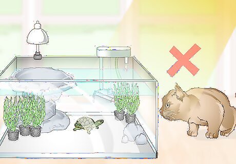 Keep your turtle tank out of direct sunlight and away from other animals. If you have other pets in your house, make sure the tank is somewhere that they can't get to, like on a counter or table. Choose a spot that's in a room temperature area that doesn't get too hold or cold. Place a mesh cover securely over the top of the tank to prevent other pets from reaching into the tank. Turtles can't fully go inside their shells so they're vulnerable to attacks.