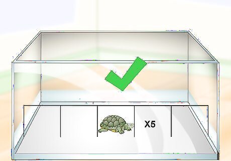 Pick a tank that’s at least 5 times the size of your turtle. Multiply the length and width of your turtle by 5 to get the minimum dimensions of its habitat. Use a tank that’s at least 30 gallons (133.5 L) for a turtle that’s 4 to 6 inches (10 to 15 cm). For a turtle that’s 6 to 8 inches (15 to 20 cm), go with a 55-gallon (208 L) tank and, for a turtle that’s larger than 8 inches (20 cm), get a tank that’s between 75 and 125 gallons (284 and 473 L). If you have a baby turtle that is going to get bigger, you can start with a smaller tank appropriate for its current size and then move it to a larger tank as it grows. For example, a red-eared slider will grow to be about 10 to 12 inches (25 to 30 cm) long, so buy a tank that's at least 50 to 60 inches (130 to 150 cm) long.