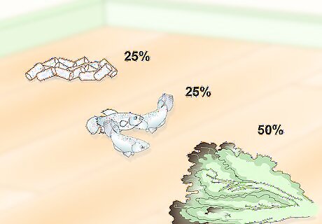 Give your turtle a diet of 25% pellets, 25% protein, and 50% plants. Feed your pet pelleted food made specifically for turtles, along with protein, like fish or insects. For plants, choose dark leafy greens like lettuce, cabbage, kale, or dandelion leaves. You can also give your turtle veggies like broccoli or celery. Chop it into small bite-sized pieces first. Buy turtle pellet food from a pet store or online retailer. Some popular protein options for turtles include earthworms, caterpillars, crickets, and mosquito fish. Different species of turtle have different dietary needs. Always research the type of turtle you have so you know you're feeding it a healthy diet.Warning: Avoid giving your turtle scraps of your own food or food from other pets. It can make them sick.