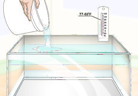 Add non-chlorinated water that’s 77 to 80 °F (25 to 27 °C). Fill the tank with water depending on the type of turtle you have. Aquatic turtles requires 75% of the tank to be water, semi-aquatic turtles require 50%, and tortoises require 25% or less. Keep a thermometer in the water so you can monitor the temperature to make sure it doesn’t get too cold or warm. If you have a red-eared slider, map turtle, or painted turtle, know that these are aquatic turtles, so they need at least 75% of the tank to be water.Tip: You may need to place a heating pad underneath the tank or use a submersible heater to maintain water that’s between 77 and 80 °F (25 and 27 °C).