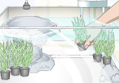 Decorate your turtle’s habitat with plants and rocks if you want to. To make the tank more aesthetically pleasing or to provide entertainment for your pet, add decorations like aquatic plants, peat moss, or large rocks. Make sure you leave enough open space for your turtle to move around freely though. Box turtles, for instance, like having a place to hide, so include a hollowed out log or small shelter. Some popular aquatic plants for turtle tanks include hornwort, java fern, or waterweed. Avoid using gravel or rocks smaller than your turtle’s head. Otherwise, your pet may try to eat them and could choke. You can also use fine sand or fluorite to line the bottom of the tank. Don't pick rocks or sand from nature, though, as they can contain harmful bacteria. Buy the materials from a pet store or online retailer.