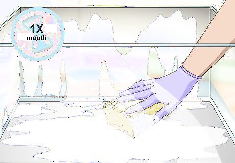 Clean the tank at least once a month. Remove everything from the tank, then fill it with a diluted bleach solution made with 1 part bleach and 9 parts water. Let it sit for 10 minutes before rinsing the tank out with water. Do this at least one time every month, especially for aquatic turtles who spend most of their time in the water. Keep your turtle in a bucket, bowl, or carrying case while you clean the tank. Wear gloves when dealing with bleach to protect your hands. If you notice feces in the tank in between cleanings, use a paper towel or plastic glove to pick it up.