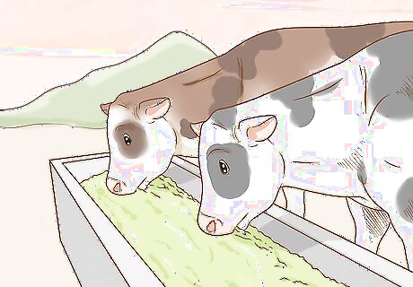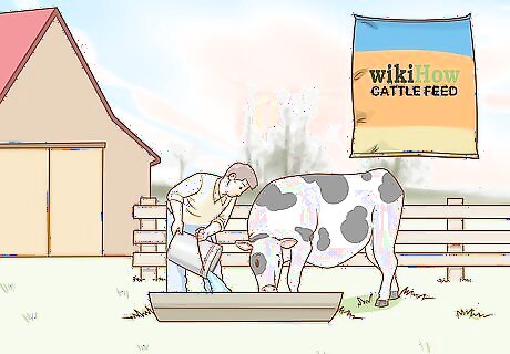 Talk with your vet about which grain or hay to use and how much to feed your cattle. Pastured cattle can survive by primarily eating grass. However, if your cattle are primarily in a dry-lot or if the weather is poor, then supplementing with grain or hay is a good idea. Use a hay rack or clean feed container in a paddock or barn to give your cattle hay or grain. Wet, moldy food can actually sicken your animals. If the hay or grain gets wet, discard it immediately. Feeding your cattle grain helps you to form a positive relationship with them, too. They’ll associate you with food and are more likely to come to your calls.
