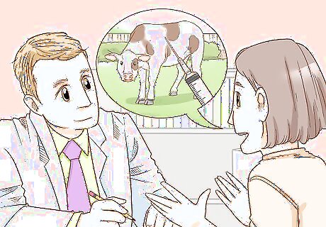 Your vet can help prevent diseases and give vaccinations. Your vet will be able to tell you which vaccinations are suggested for your cattle. Some shots you may be able to give on your own, but others will require a vet visit. It’s also important to monitor your dry-lot cattle especially closely, as they are more prone to illnesses, such as pneumonia. A dry-lot is a fenced area that is free from grass. Most cattle owners rotate their animals between dry-lots, grassed areas, and enclosures. Dry-lot cattle often suffer from respiratory illnesses caused by the dust in the air. Cattle vaccinations can help to protect your animals from diseases, such as blackleg or Bovine Viral Diarrhea (BVD). Monitor the health of your bulls closely during breeding season, as they can injure one another in the process of competition for breeding rights.
