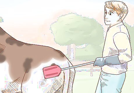 Using electric cattle prods can actually make your cattle behave recklessly. Similarly, whips can also scare your cattle and make them not trust you. Instead, to encourage your cattle to move, apply gentle pressure with a plastic paddle or the sides of a broom. A paddle is often a good idea because it is a wider tool and cattle can more easily track it. If you move slowly and carefully, then this can minimize their fear. Also, if you grab your cattle’ tails, do so carefully to avoid injuring them. Pulling or twisting their tails can actually cause breakage.
