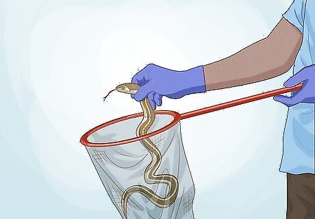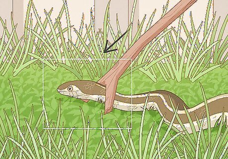 Make your move. So long as you are certain that the snake before you is a garter snake, you needn't take extreme precautions as you would with a more dangerous snake. Of course, if there's any chance that the snake may be a more dangerous type, you should put a halt to your outing until you are able to verify that the snake is not a threat. If you brought along a forked stick, you can now use it to help you pin down the snake. This will make it easier for you to be able to grab it or scoop it into your net, and can also help prevent it from biting you. Try to place the forked end of the stick as close behind the snake's head as possible. If you place it lower down on the body, the snake may be able to twist around and bite you.