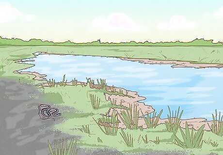Survey the landscape. If you are intent on catching a garter snake for observational purposes or to keep as a pet (please think twice before catching one to use as part of a prank!), you should spend some time scoping out the areas where snakes are most likely to be found. Generally speaking, garter snakes migrate around moist areas with still water sources; you may be able to find them in these areas when they are on the hunt for their various prey (insects, frogs, and small mammals). As reptiles, garter snakes are “ectotherms,” which means that they must obtain their heat from external (outside) sources. Consequently, these “cold-blooded” creatures can often be found basking on rocks on cooler days in an effort to warm up, and resting in shady spots when it is warmer.