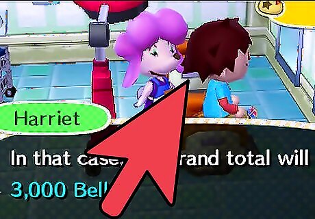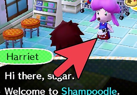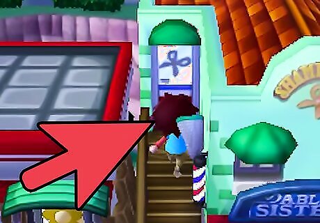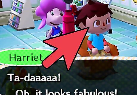 Get a haircut. Take a seat in the red chair on the left side of the room, and Harriet will approach you and ask what you want to get done today. Select the haircut option, and answer her questions to determine which style you will get. It costs about 3,000 bells to get a haircut.