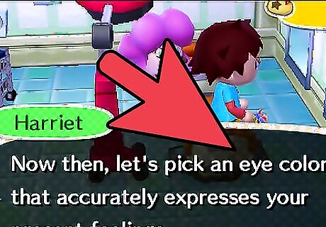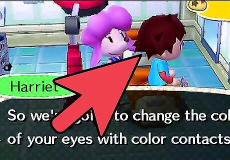Visit Shampoodle. Although you have now unlocked Shampoodle, you are not immediately given the option to change your eye color. The hairstylist, Harriet, will only give you the choice to change hairstyle or makeup when the salon is first built. To get started on unlocking the Eye Color Change feature, visit Shampoodle during its operating hours, which are from 10 a.m. to 8 p.m.