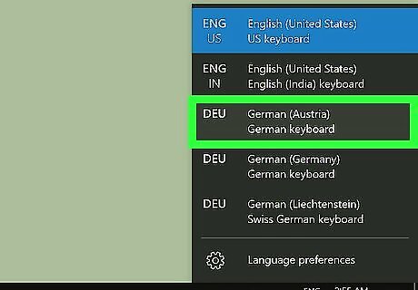 Click the language icon on the taskbar. This will open a list of your saved, available keyboard layouts in a pop-up window. Your list of saved keyboards may include different languages, alphabets, or just different layouts for the English keyboard. If you don't see the language you want here, click Language preferences in the pop-up, and download the language or layout you want to use.