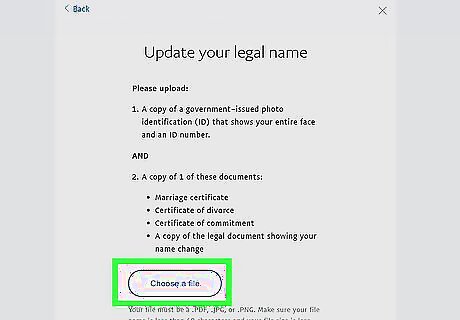 Click Change your legal name, Update your name, or Make a minor correction. If you choose either of the first two options, you'll need to upload proof of your name. If you choose Change your legal name, you'll need to upload a copy of a government-issued photo identification (ID) that shows your face and an ID number, as well as a copy of your marriage (or divorce) certificate, certificate of commitment, or a copy of the legal document showing your name change. If you choose Update your name, you'll need to upload a copy of a government-issued photo identification (ID) that shows your face and an ID number, as well as a copy of a utility bill with your name and address, a bank statement for your linked bank account, or a recent credit card statement for the card linked to your PayPal account. If you choose Make a minor correction, you can only make one change to your name. Otherwise, you'll need to contact support for help.