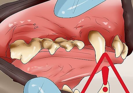 Monitor the dog's dental health. Don't overlook your dog's dental health. While your vet will check their teeth at their check-up, you need to monitor for signs of gum disease and keep up on their dental hygiene as well. Dogs' jaw and heart health, in fact, have been linked to their dental health. In particular, don't ignore bad breath. This is usually the first sign of a potentially more serious condition. If their breath is ever bad enough to make your gag, take them to see the vet.