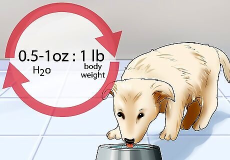 Ensure your dog is well hydrated. Hydration is an important component of your dog's health. It is also easy to overlook. Further, even if your dog is well-hydrated at the time of their check-up, you need to ensure they stay hydrated generally. As a rule of thumb, your dog should be drinking between 0.5 to 1 ounce (15 to 30 ml) of water each day per pound (.5 kg) of body weight. To check for dehydration, pull up on a pinch's worth of your dog's skin on the back of their neck. It should quickly slide back into position. If it slowly returns and leaves a small “tent” of skin, your dog needs to be drinking more water. You may also check your dog's gums for signs of dehydration by touching them with your finger. If they feel sticky or dry, make sure to provide more water for your dog.