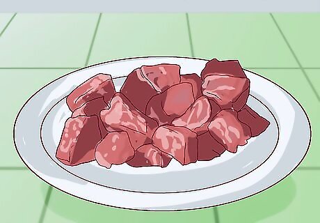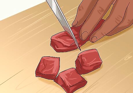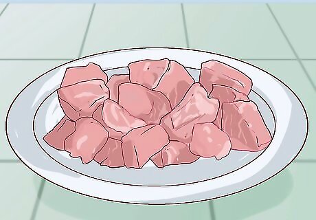 Cut the meat into same-size pieces yourself. You want to cut your meat into individual pieces yourself for two reasons. First, it will be easier to trim away the gristle from a larger cut of meat, as opposed to small pieces. Further, by doing it yourself, you can ensure that the size of the individual pieces are uniform. As a rule of thumb, shoot for cubes of meat that are a bit larger than 1x1in (2.5x2.5cm).