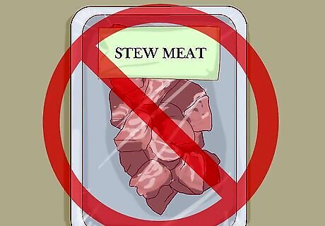 Do not rely on packages labelled "stew meat." Sometimes pre-packaged meat labelled in such a way are perfect for making stew. However, in many cases it is instead an assemblage of the odds and ends from different cuts of meat. The reasoning here is that those pieces of meat from different parts of the animal will cook at different rates. With pre-cut “stew meat” that feature different cuts of meat, you'll end up with some tender pieces of meat in your finished stew, but others that are tough and chewy. Further, fat content will differ between pieces of meat, making it hard to tell how lean your meal will be. If stew meat is the best option, choose the package that seems to have pieces that are generally the same size, and which contain visible white striping within the flesh.