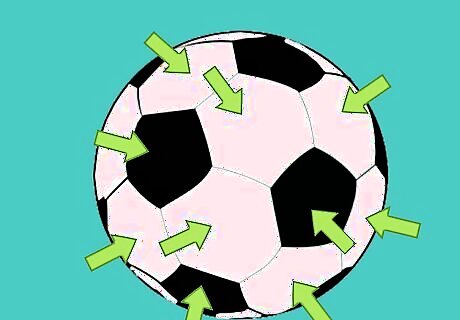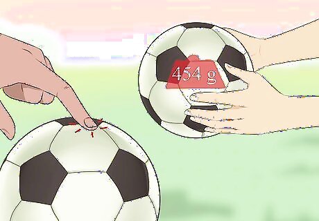 Feel its weight and hardness. Pick a ball that is less likely to hurt you and other players when kicked, caught, or headbutted. Avoid balls that feel especially heavy or rock-hard. At the same time, avoid very soft balls, since these are more likely to bounce and go off-target. Ideally, choose the lightest ball you can find. If this is for league play or training, refer to their guidelines about acceptable weight. #5 balls typically weigh between 14 and 16 ounces (397 to 454 g). #4 balls should weigh be between 12 and 13 ounces (340 to 369 g). #3 balls should be between 11 and 12 ounces (312 to 340 g).