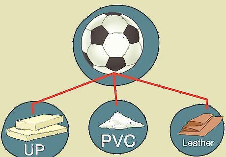 Decide between outside materials. Expect most modern balls to be covered in either PU (polyurethane) or PVC (polyvinyl carbonate). Choose between them based on your needs, since each offers different strong points. However, be aware that the quality of material in each case may vary, meaning that not all PVC balls are equal to each other; ditto with PU balls. PU: more responsive to foot work; generally used for match balls. PVC: more durable; used for training and indoor balls. Leather: still used in some construction, but frowned upon due to its absorption of water.
